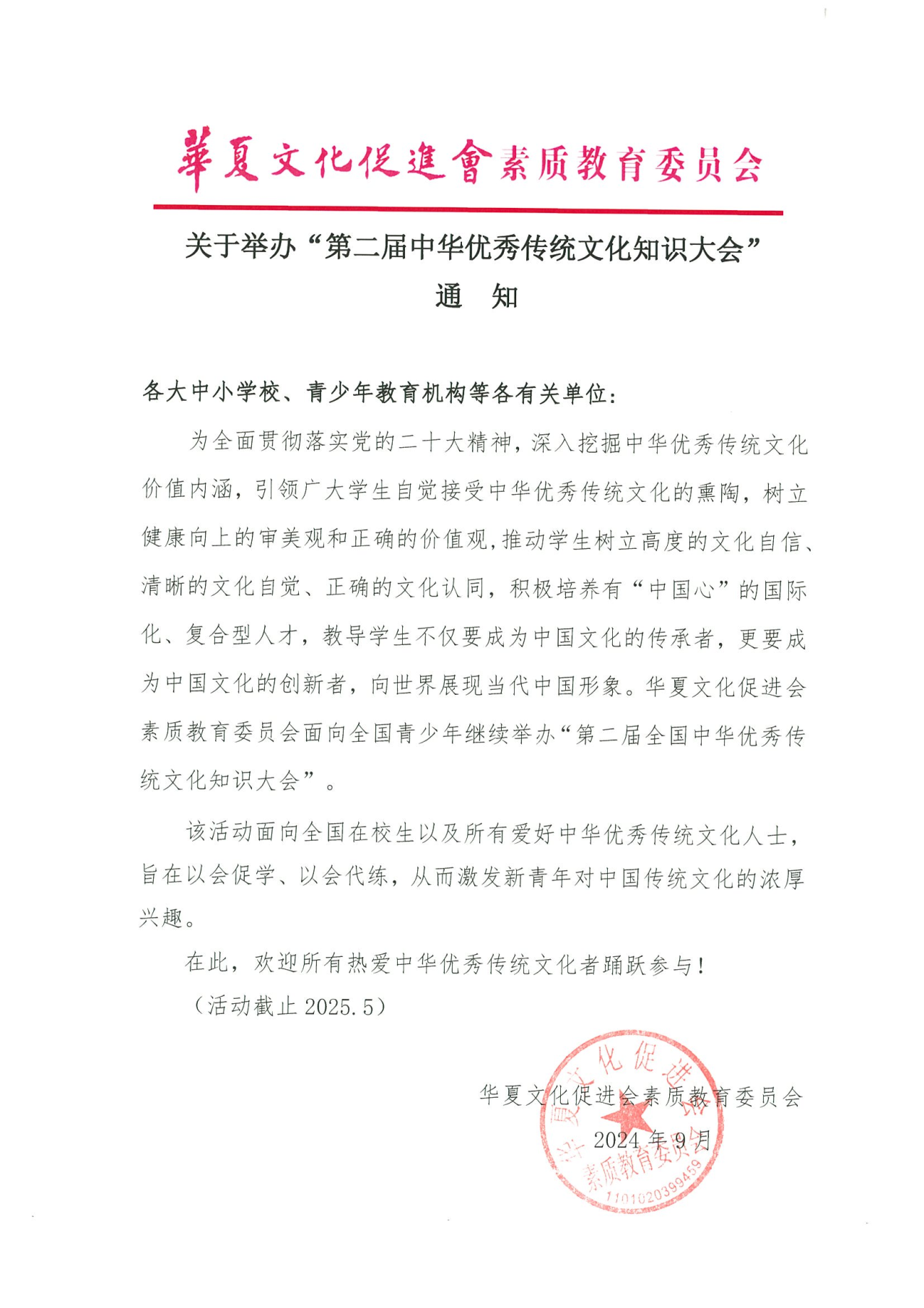 为全面贯彻落实党的二十大精神,深入挖掘中华优秀传统文化价值内涵,引领学生自觉接受中华优秀传统文化的熏陶,树立健康向上的审美观和正确的价值观,推动学生树立高度的文化自信、清晰的文化自觉、正确的文化认同,积极培养有“中国心”的国际化、复合型人才,教导学生不仅要成为中国文化的传承者,更要成为中国文化的创新者,向世界展现当代中国形象。上届活动成功举办,受到老师和参与者的广泛好评,华夏文化促进会素质教育委员会特举办第二届中华优秀传统文化知识大会。